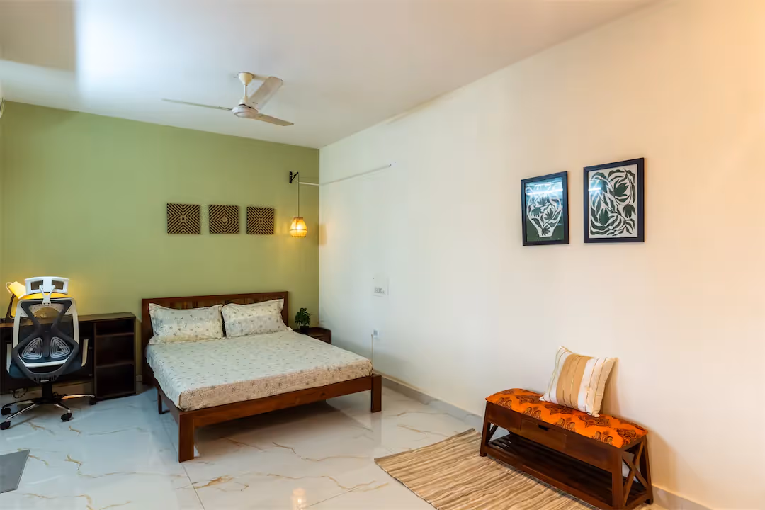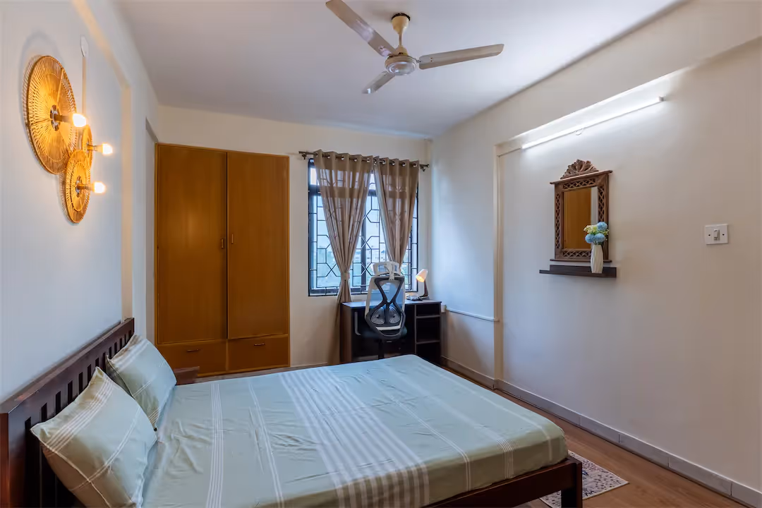 Perched high above the bustle of Old Madras Road, this 3BHK duplex penthouse offers a rare mix of warmth, privacy, and connectivity. The home opens into an airy living space finished in rich wood tones and cozy textures, leading to a breezy terrace that’s perfect for slow mornings or late-evening conversations. Thoughtfully furnished and spread across two levels, it balances character with comfort — every detail designed to make daily living effortless. Located just steps from Benniganahalli Metro Station, it gives you unmatched city access while still feeling tucked away. With amenities like a rooftop lounge, swimming pool, and fitness zone, the home is ideal for those who want convenience, calm, and a touch of individuality — all in one address.
